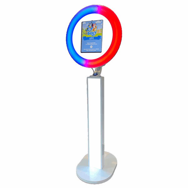 Unsere Fotobox ist ausgestattet mit einem RGB-Ringlicht, dessen Farben und Animationen für die perfekte Stimmung sorgen. In der Mitte befindet sich ein Tablet mit spezieller Fotobox-Software, über das deine Gäste spielend einfach Fotos aufnehmen und direkt bearbeiten können – inklusive Stickern, Filtern und Effekten. Der Welcome Screen kann auf deine Veranstaltung angepasst werden, sodass die Fotobox von Anfang an perfekt zu deinem Event passt.